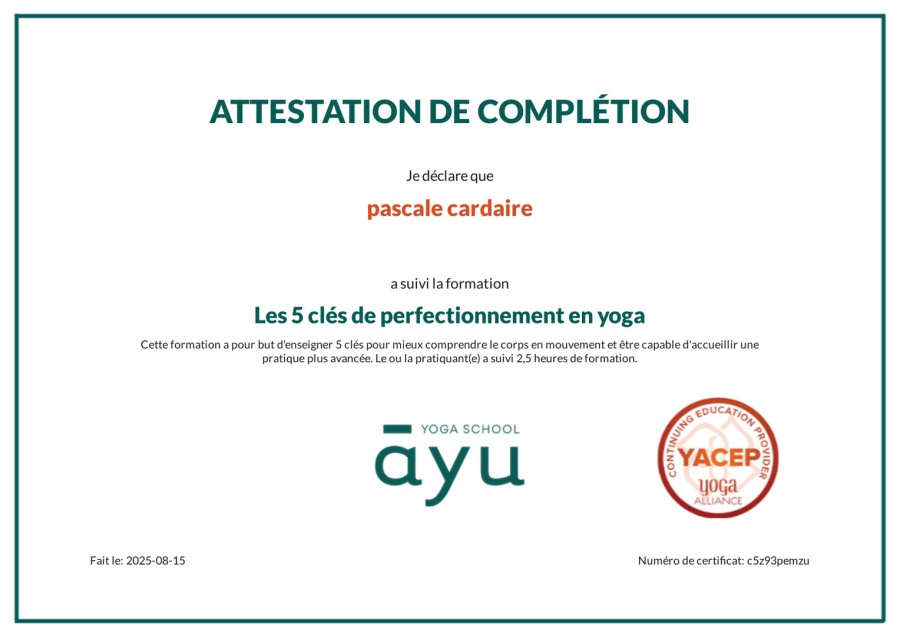 En 2025, je perfectionne ma pratique et mon enseignement du Yoga auprès d'Ayu Yoga School sur les 5 clés de perfectionnement en Yoga pour une pratique plus avancée.